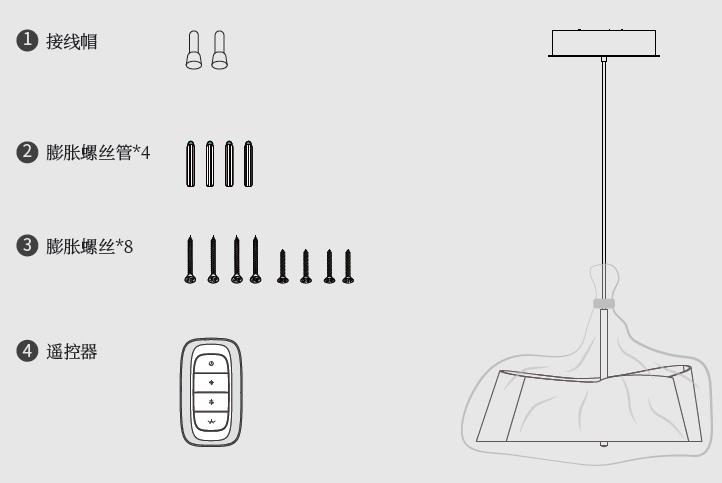 膨胀螺栓*4;十字头螺钉*2;接线帽*3;遥控器*1(遥控版本);灯体*1